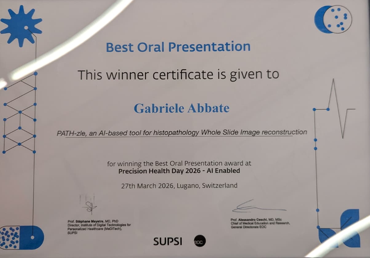 Abbate, G., Forni, B., Giudici, L., Migliora, P., Mazzucchelli, L., Martin, V., & Giusti, A. (2026). PATH-zle, an AI-based tool for histopathology Whole Slide Image reconstruction. In Precision Health Day 2026 – AI Enabled.